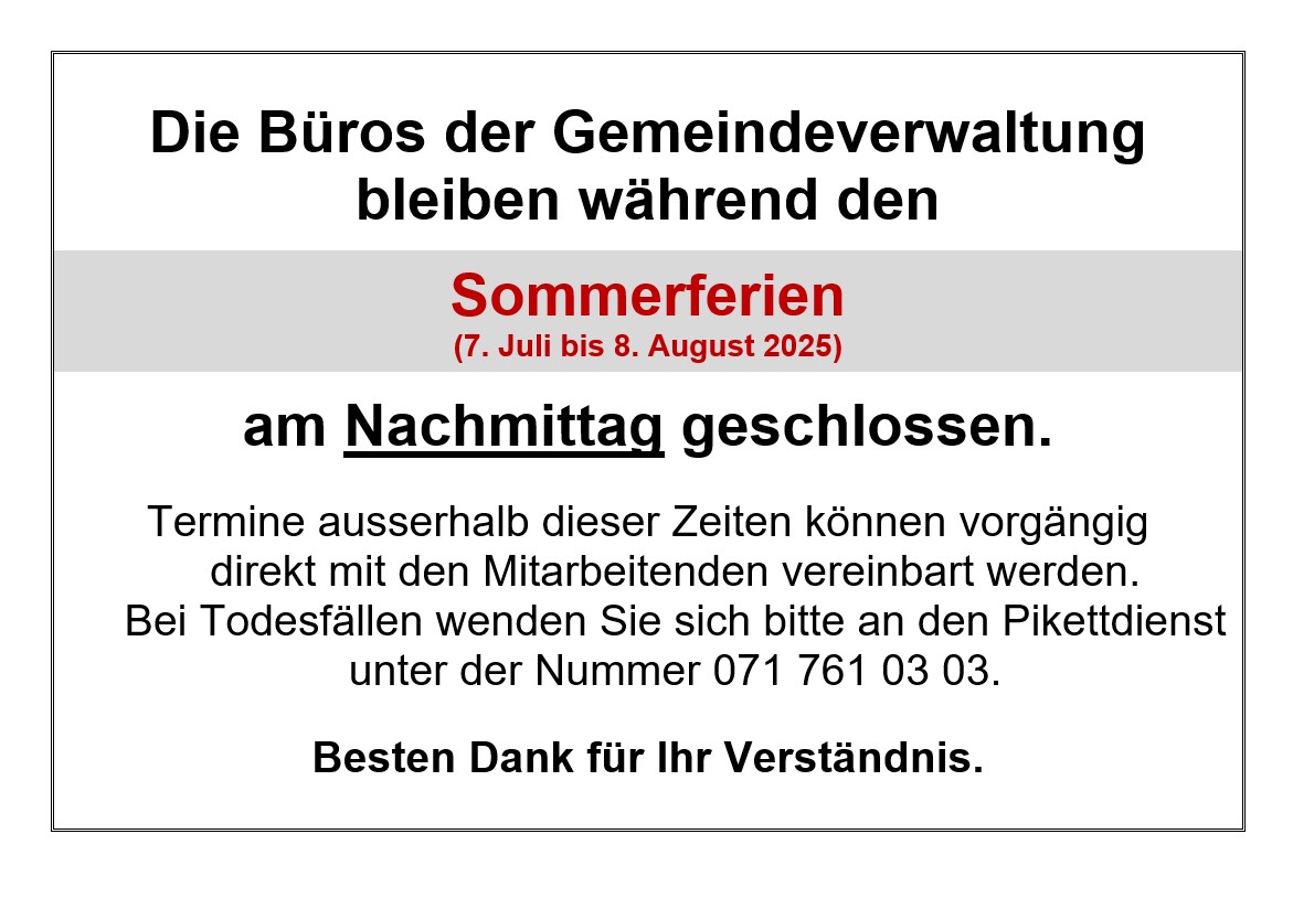 Die Büros der Gemeindeverwaltung in Oberriet bleiben während den Sommerferien vom Montag, 7. Juli 2025, bis Freitag, 8. August 2025, jeweils am Nachmittag geschlossen. Am Vormittag sind die Büros wie gewohnt von 08.00
