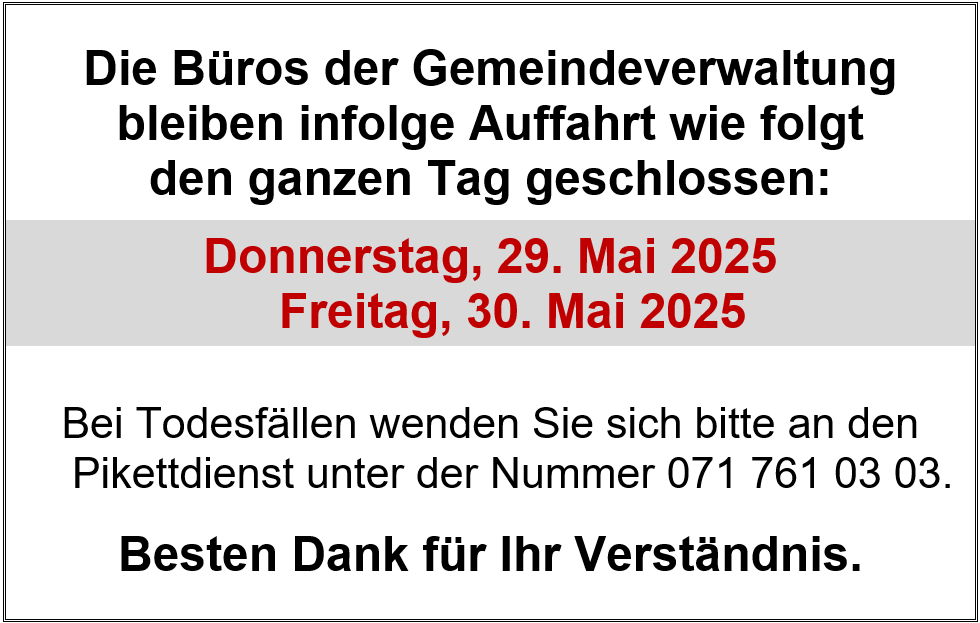 Die Büros der Gemeindeverwaltung und des Werkhofs Oberriet bleiben infolge Auffahrt wie folgt den ganzen Tag geschlossen: 29. Mai 2025 30. Mai 2025 In dringenden Fällen erreichen Sie die Pikettdienste unter folgenden Telefonnummern: Bestattungsamt: 071 761 03