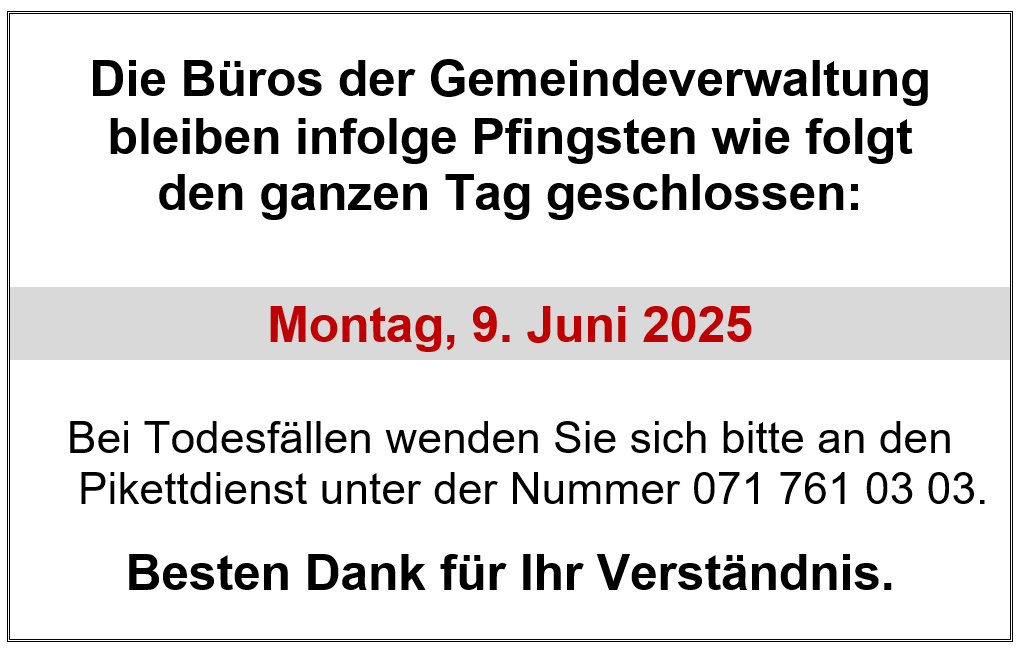 Die Büros der Gemeindeverwaltung und des Werkhofs Oberriet bleiben infolge Pfingsten wie folgt den ganzen Tag geschlossen: 9. Juni 2025 In dringenden Fällen erreichen Sie die Pikettdienste unter folgenden Telefonnummern: Bestattungsamt: 071 761 03 03 (Herrsche Bestattungen