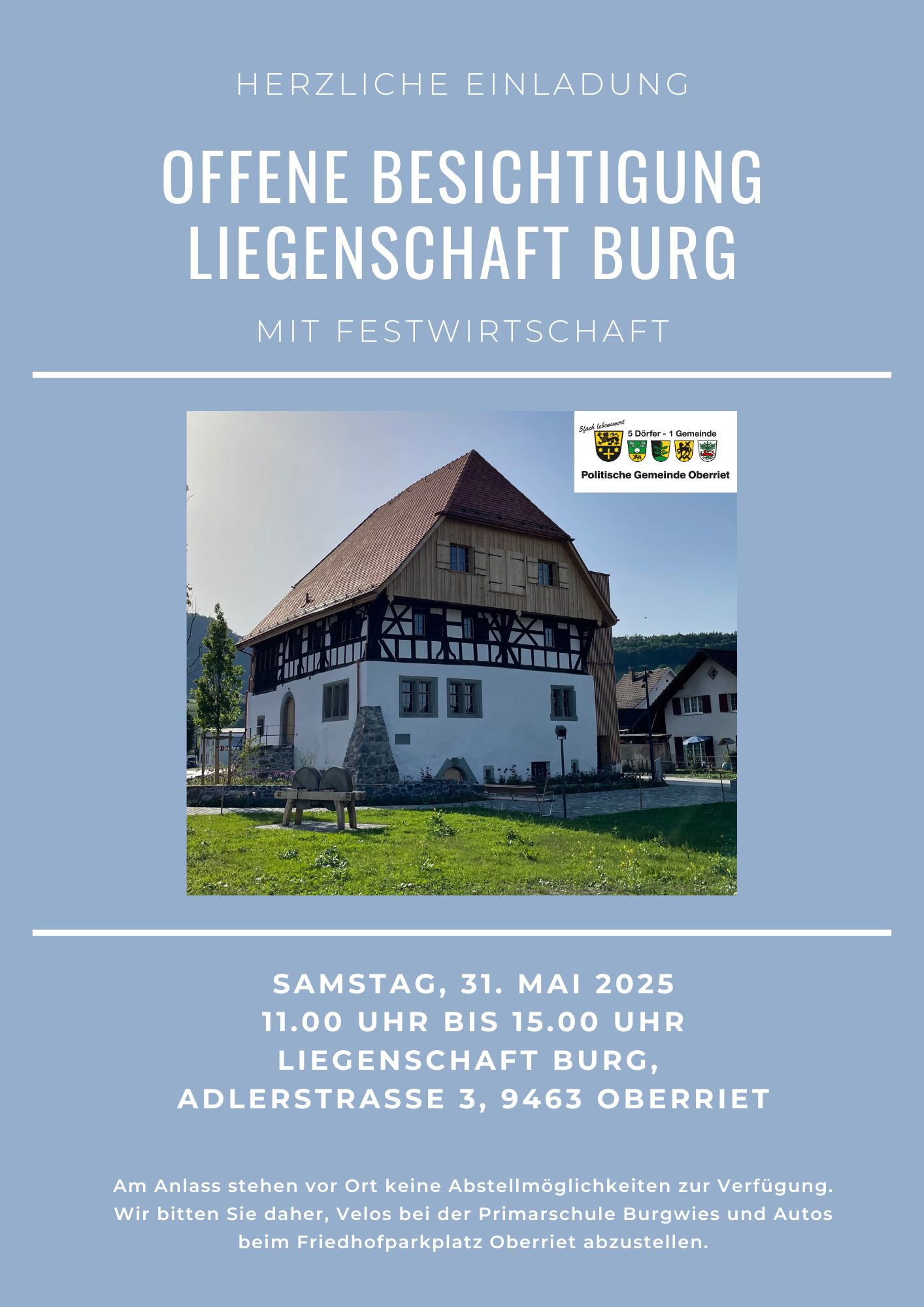 Gerne lädt der Gemeinderat Oberriet alle Einwohnerinnen und Einwohner sowie alle interessierten Personen zur Teilnahme an der offenen Besichtigung der Liegenschaft Burg ein. Die finalen Sanierungsarbeiten in der Liegenschaft Burg wurden erfolgreich abgeschlossen. Jetzt