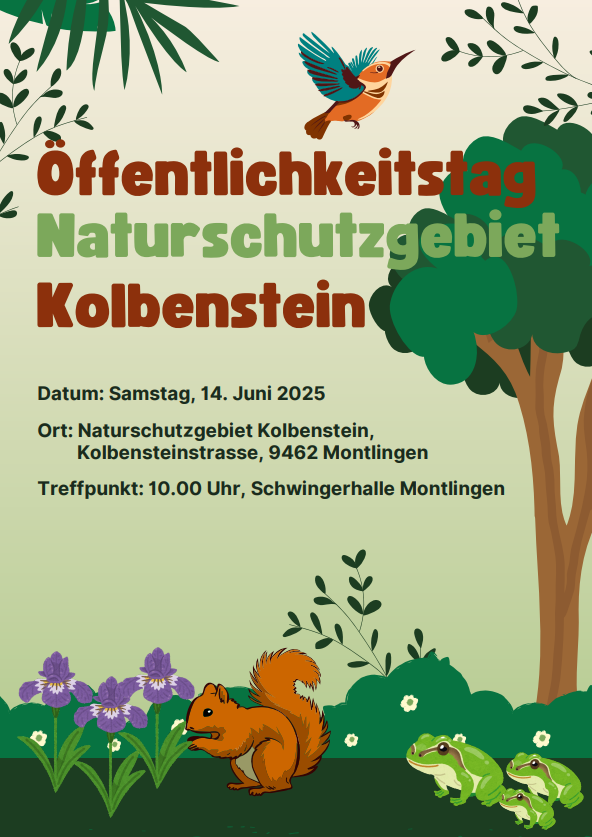 Gerne laden die Naturschutzkommission und der Gemeinderat Oberriet alle Einwohnerinnen und Einwohner sowie alle interessierten Gäste aus nah und fern zur Teilnahme am Öffentlichkeitstag im Naturschutzgebiet Kolbenstein ein. Es wird unter anderem über Dohlen,