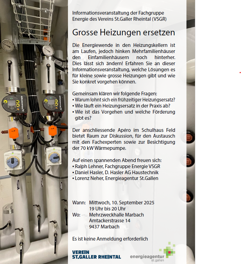 Die Fachgruppe Energie organisiert am Mittwoch, 10. September 2025, um 19:00 Uhr in der Mehrzweckhalle Marbach eine öffentliche Informationsveranstaltung zum Thema «Grosse Heizungen ersetzen». Die Veranstaltung richtet sich insbesondere an Eigentümer/innen und Verwaltungen von