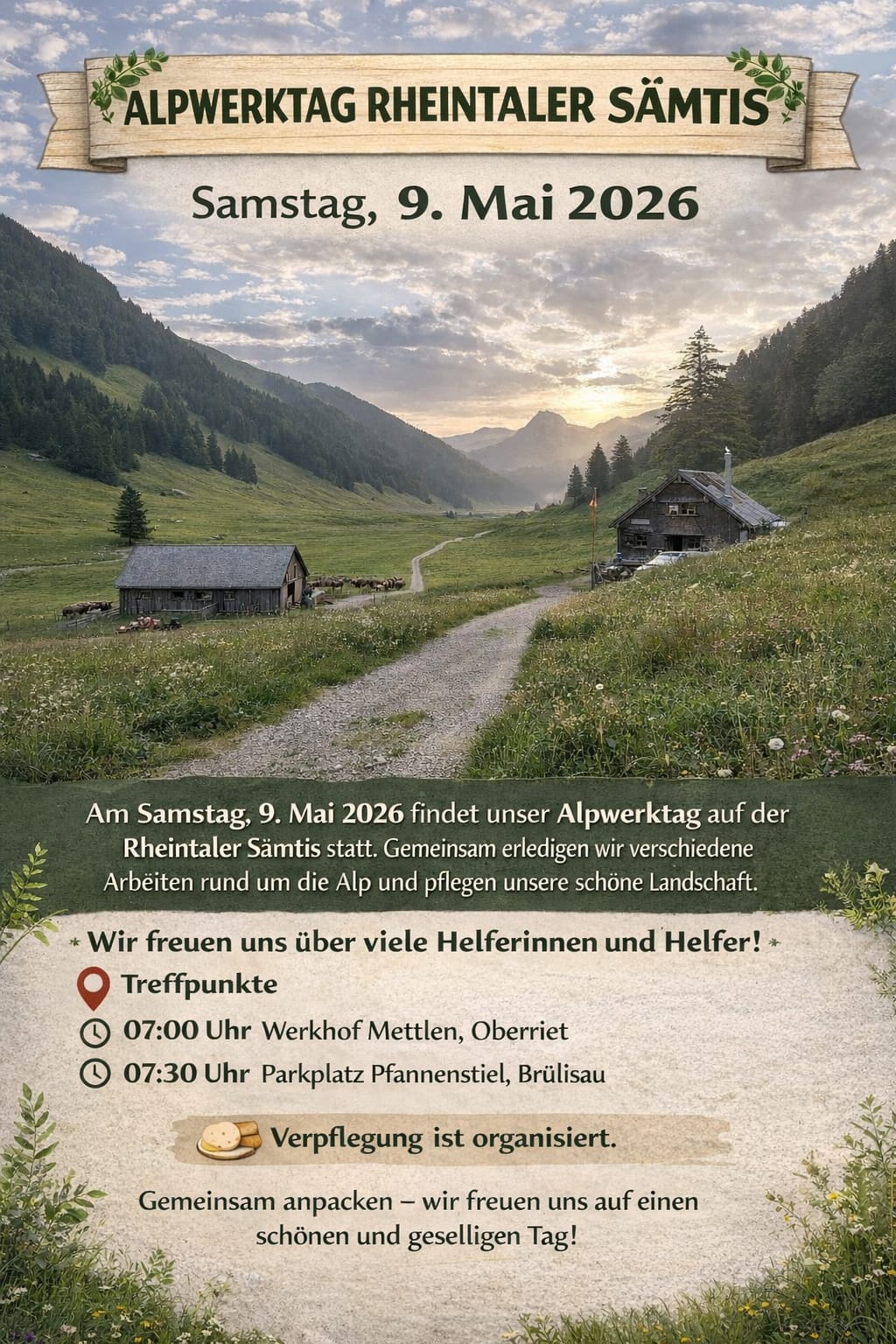 Am Samstag, 9. Mai 2026 findet unser Alpwerktag auf der Rheintaler Sämtis statt. Gemeinsam erledigen wir verschiedene Arbeiten rund um die Alp und pflegen unsere schöne Landschaft. Wir freuen uns über viele Helferinnen und Helfer!